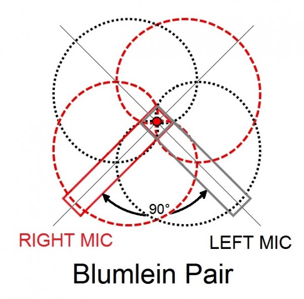 - التموضع: يوضع المايكروفونان في مواجهة الآلة الموسيقية، وويتم الفصل بينهما بزاوية 110 درجة من الأمام، وبمسافة 17 سم من الخلف.