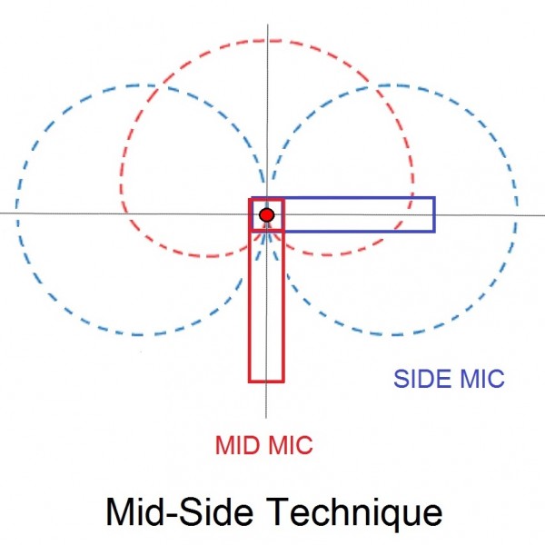 - التموضع: يتم وضع المايكروفون أحادي الإتجاه بمقابل الآلة الموسيقية، والذي سيمثل الجزء "منتصف" في هذه الطريقة، ويتم وضع المايكروفون ثنائي الإتجاه بزاوية 90 درجة مع الآلة الموسيقية، وسيمثل الجزء "جانب" من هذه الطريقة، ويكون المايكروفون الأول أعلى من الثاني أو مجاور له من منطقة الرأس.